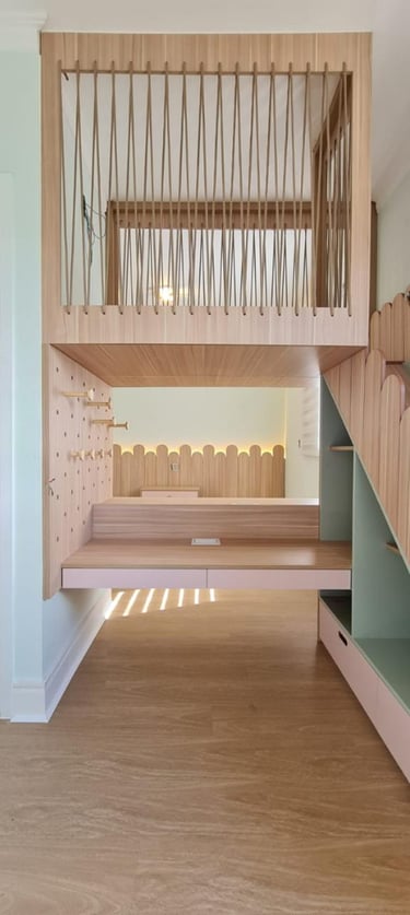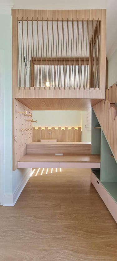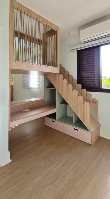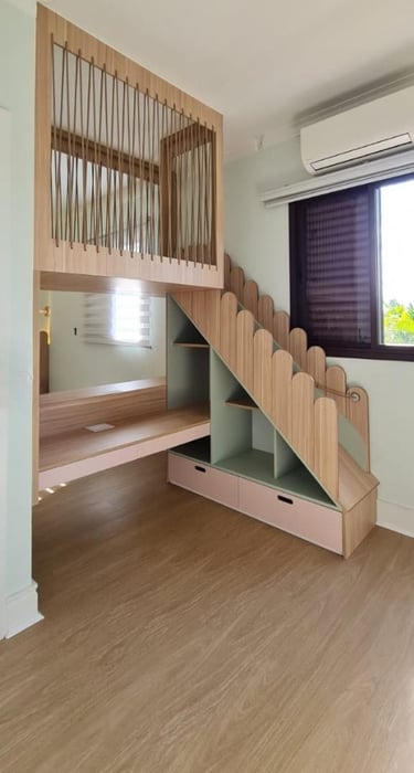 Marcenaria Inteligente: Cada centímetro foi pensado. A escada que leva ao mezanino também é um armário e termina em um divertido escorregador. A área de estudos foi integrada sob o mezanino, com uma bancada ampla, iluminação dedicada e um painel "pegboard" para organizar materiais. Tudo foi feito em madeira clara, com toques de rosa e verde pastel, criando uma paleta de cores que é, ao mesmo tempo, calmante e alegre.